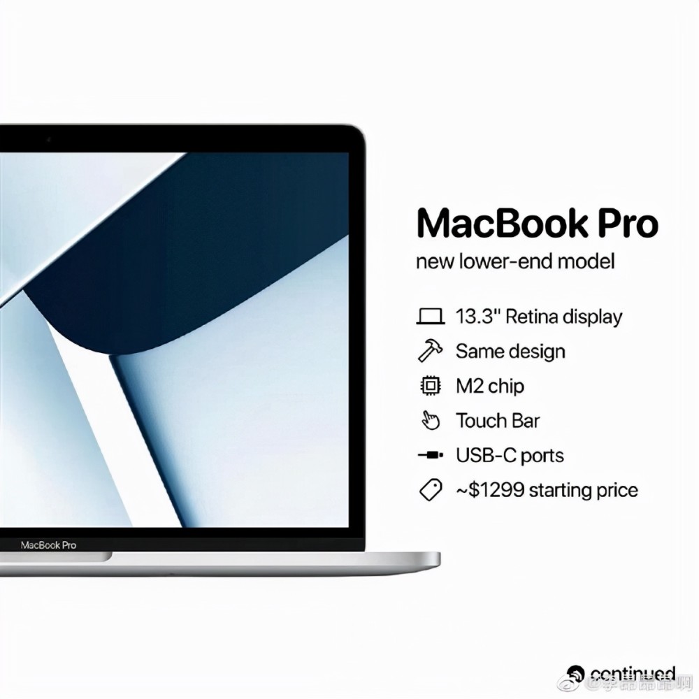 另外,搭载自研M2芯片的MacBook Pro也是本次发布会的主角之一,其尺寸为13.3英寸,性能强劲的同时,也将带来更高的体验,并且支持USB-C接口,网传价格会在1299美元起售,但具体还要看官方最终揭晓。